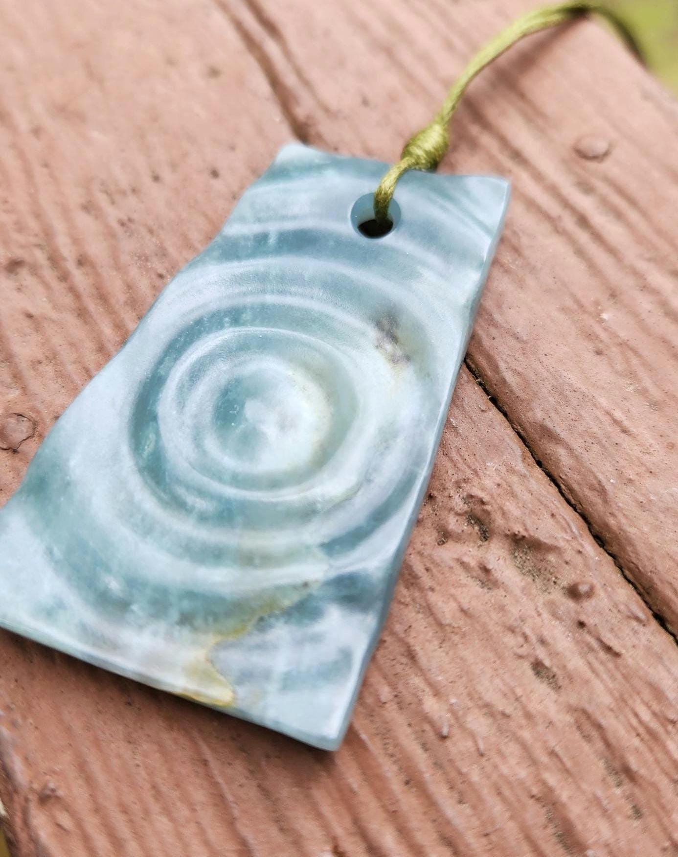 This pendant is hand carved beautiful high quality princessa blue jadeite. The design is based on a drop in the water rippling. It‘s also meant to be a sensory piece, designed to be enjoyed just as much in the hand as it is to be worn and seen. A soft rolling texturet‘s to sooth the nerves and occupy your hand. strung on an adjustable cotton cord.