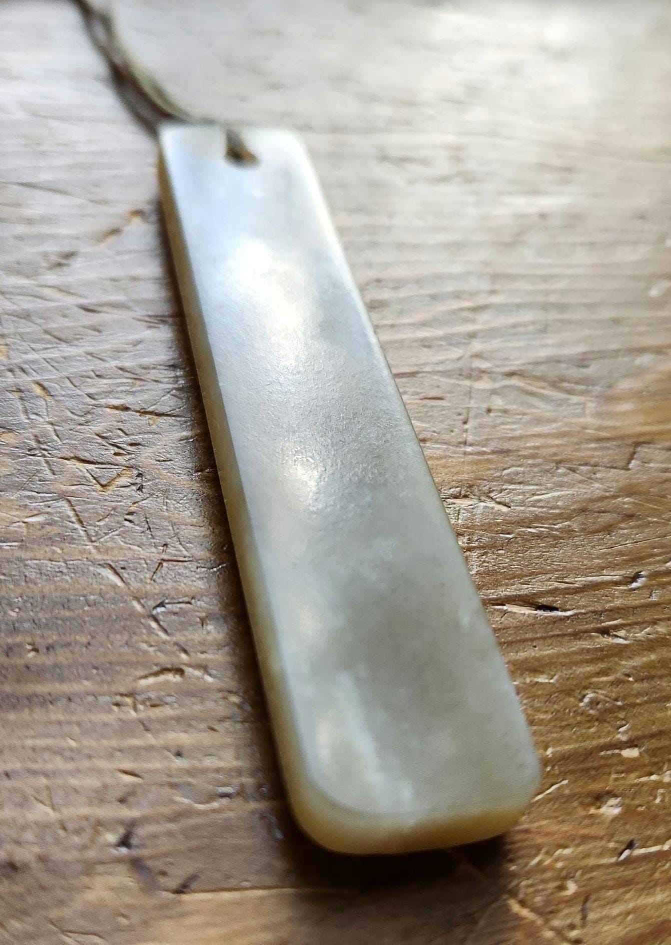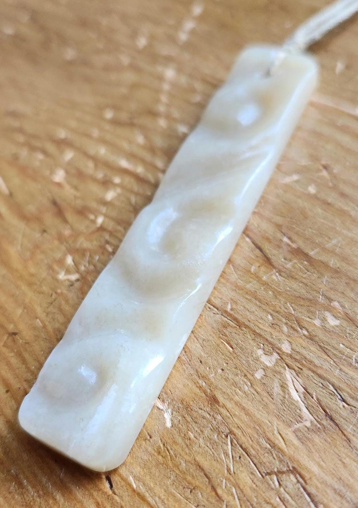 Hand carved siberian nephrite jade pendant. The spiral designs are inspired by the Maori Koru design.