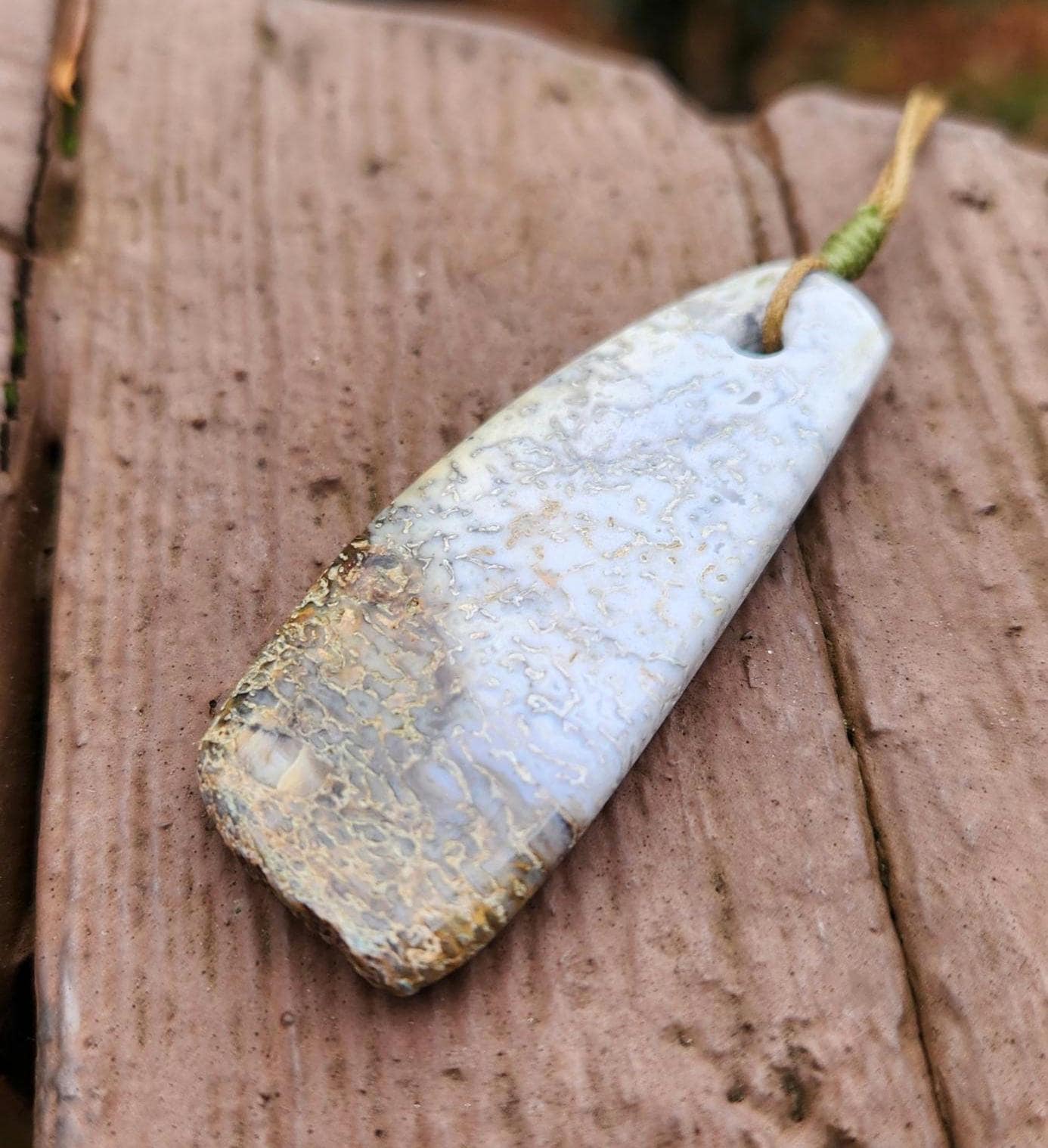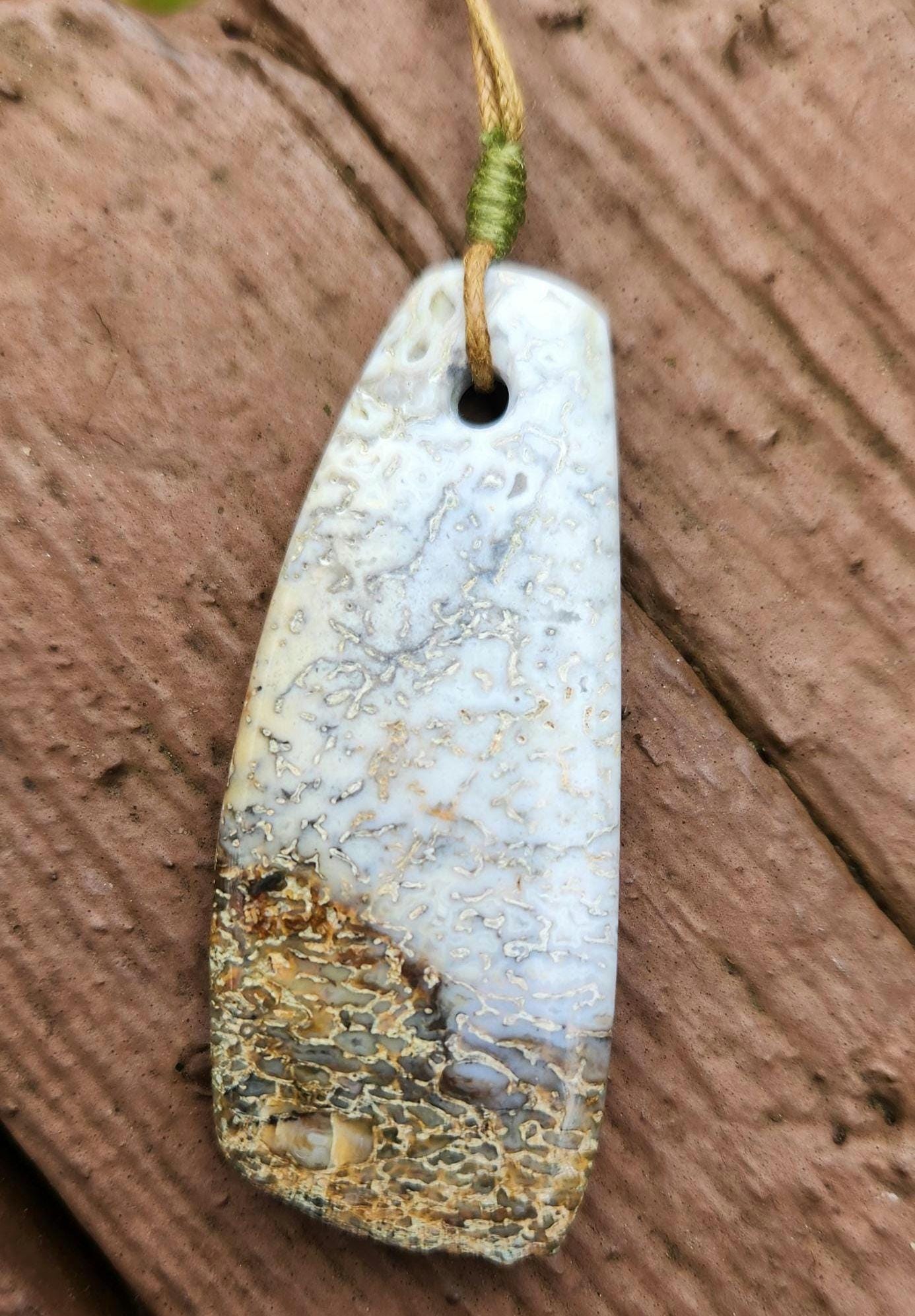 Hand carved and polished live edge white utah gembone pendant. Bound on an adjustable cotton cord.